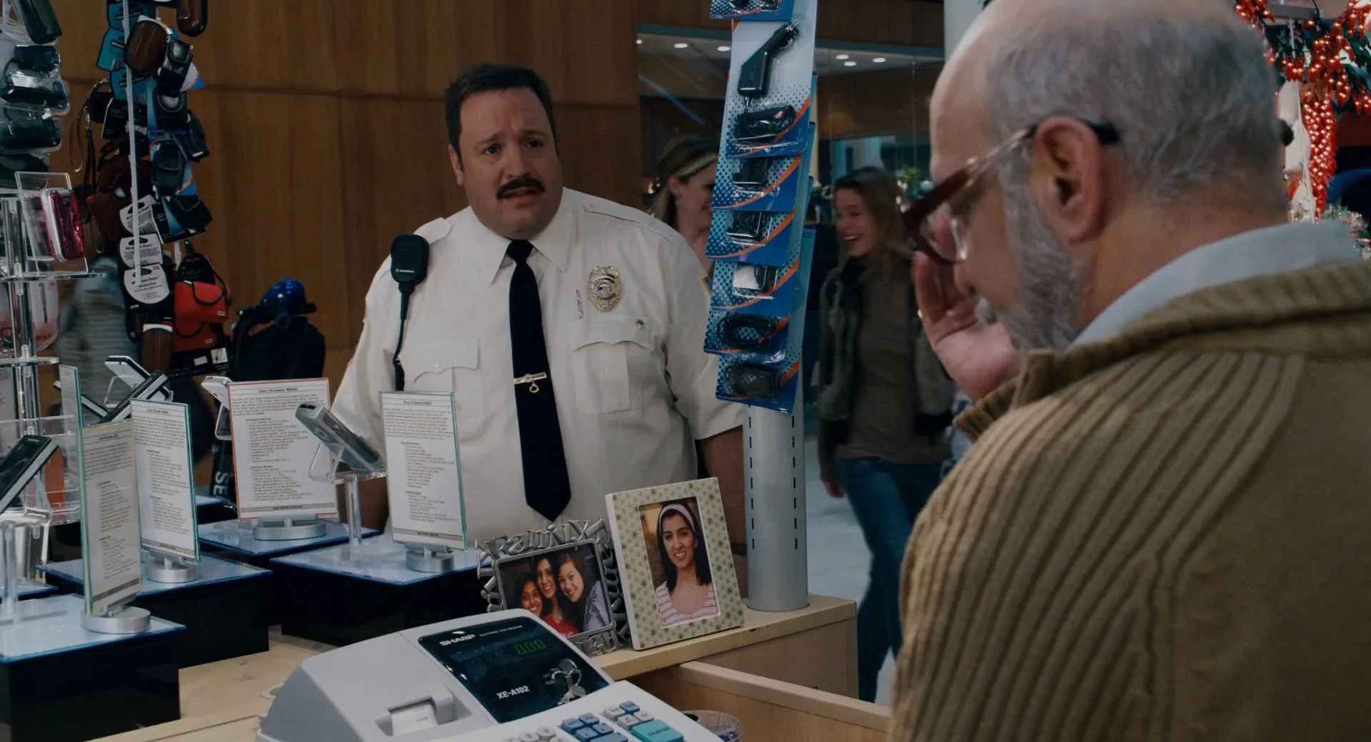 Cast: Kevin James as Paul Blart, Keir O'Donnell as Veck Sims, Jayma Mays as Amy, Bobby Cannavale as Cmdr. James Kent, Shirley Knight as Mom, Raini Rodriguez as Maya Blart, Stephen Rannazzisi as Stuart, Peter Gerety as Chief Brooks, Adam Ferrara as Sergeant Howard, Jamal Mixon as Leon, Adhir Kalyan as Pahud, Erick Avari as Vijay, Gary Valentine as Karaoke Singer, Allen Covert as Jerky Security Guy, Mike Vallely as Rudolph, Mike Escamilla as Blitzen, Jason Ellis as Prancer, Jason Packham as Comet, Rick Thorne as Cupid, Victor T. Lopez as Donner, Natascha Hopkins as Vixen, Jackie Sandler as Victoria's Secret Sales Associate, Mookie Barker as Mr. Ferguson, Jackie Flynn as Officer, Richie Minervini as Bank Manager, Brie Hill Arbaugh as Bank Teller, Steffiana De La Cruz as Shopper with Kids, Dylan Clark Marshall as Jacob, Bernie McInerney as Old Man on Scooter, Tyler Spindel as SWAT Tech, Bas Rutten as Drill Instructor, Teresa Zantua as Shopper, Dahlia Salem as Mother, Zele Avradopoulos as Victoria's Secret Customer, Maria Arcé as Victoria's Secret Customer, Robert Harvey as SWAT Officer, Billy Concha as Joe's Patron, Michael Burton as Joe's Patron, Carl Randall as Father Carl, Carla Antonino as Joe's Waitress, Ruby Wendell as Ruby the Waitress, Lindsay MacDonald as Girl at Mall, Donna Glee Reim as Mall Patron, Dale F. Appel as Mall Shopper, Joel Arsenault as Mall Cop, Stephanie Atkinson as Shopper, Amber Baldinelli as Girl in Mall Throwing Play Balls, William Bornkessel as Shopper, Mike Burton as Joe, Katelyn Cahill as Wedding Guest, Patrick Canty as New Jersey Police Academy Trainee, Gio Castellano as Mall Shopper, Jeffrey Corazzini as Security Guard, D.W. Cormier as Mall Shopper, Benjamin Crocker as Mall Shopper, Nicholas Davis as Kid in Ball Pit, Kevin DeCoste as Shopper, Michael DeMello as Shopper, Hannah Depew as Mall Shopper, Vincent J. Earnshaw as Mall Shopper, Suzanne England as Amy's Friend at Joe's, Susan Farese as Upscale Shopper, Keith Fluker as New Jersey State Trooper, Andy Forgit as Mall Shopper, Victor Franko as Mall Shopper, Sari Gagnon as Mall Shopper, David J. Garfield as Surveillence Officer, Suzanne Gillies as Upscale Shopper, Albert Gornie as Wedding Guest, Rob W. Gray as Wedding Guest, Dane Grigas as Mall Shopper, Teresa Haney as Mall Shopper, Cody Harter as Mall Shopper, Matt Heron-Duranti as Mall Shopper, Mark Hetherington as Mall Shopper, Louis Holmes as Police Recruit, Ren Knopf as Shopper, Lynn L'Heureux as Mall Shopper, Dan Marshall as Mall Shopper / Dancing Bistro Waiter at Wedding, Andrew J McGuinness as Shopper, Todd Mello as New Jersey State Trooper, Jason Mulcahy as Police Recruit, Ron Murphy as Pedestrian, Scott Neufville as Bartender, Chris Palermo as Wedding Guest, Aaron J. Patton as Police Recruit, Alan Resnic as Mall Shopper, Brieann Rich as Mall Shopper, Michael Rich as Mall Game Shopper, Nicholas Rich as Mall Shopper, Bradley Robinson as Mall Shopper, Jessica Rockwood as Mall Shopper, Gary Roscoe as Restaurant Patron, Jonathan Sawicki as Mall Shopper, Cate Smit as William Sonoma Employee, Gustin Smith as Video Game Hurdler, Ylian Alfaro Snyder as Upscale Mall Shopper, Jon Robert Stafford as Mall Shopper, George J. Vezina as Bar Patron / Shopper, Donald Warnock as Wedding Guest, Jon Warnock as Late-Night Mall Denizen, Mike Wendt as Mall Shopper, Kent R. Williams as Shopper